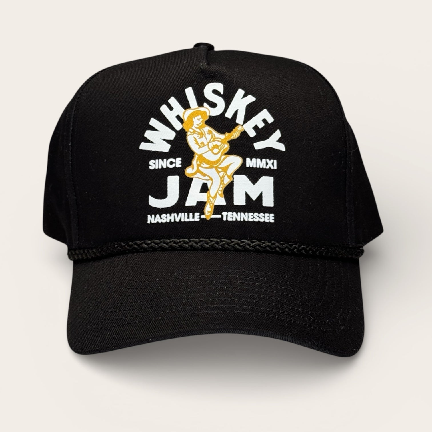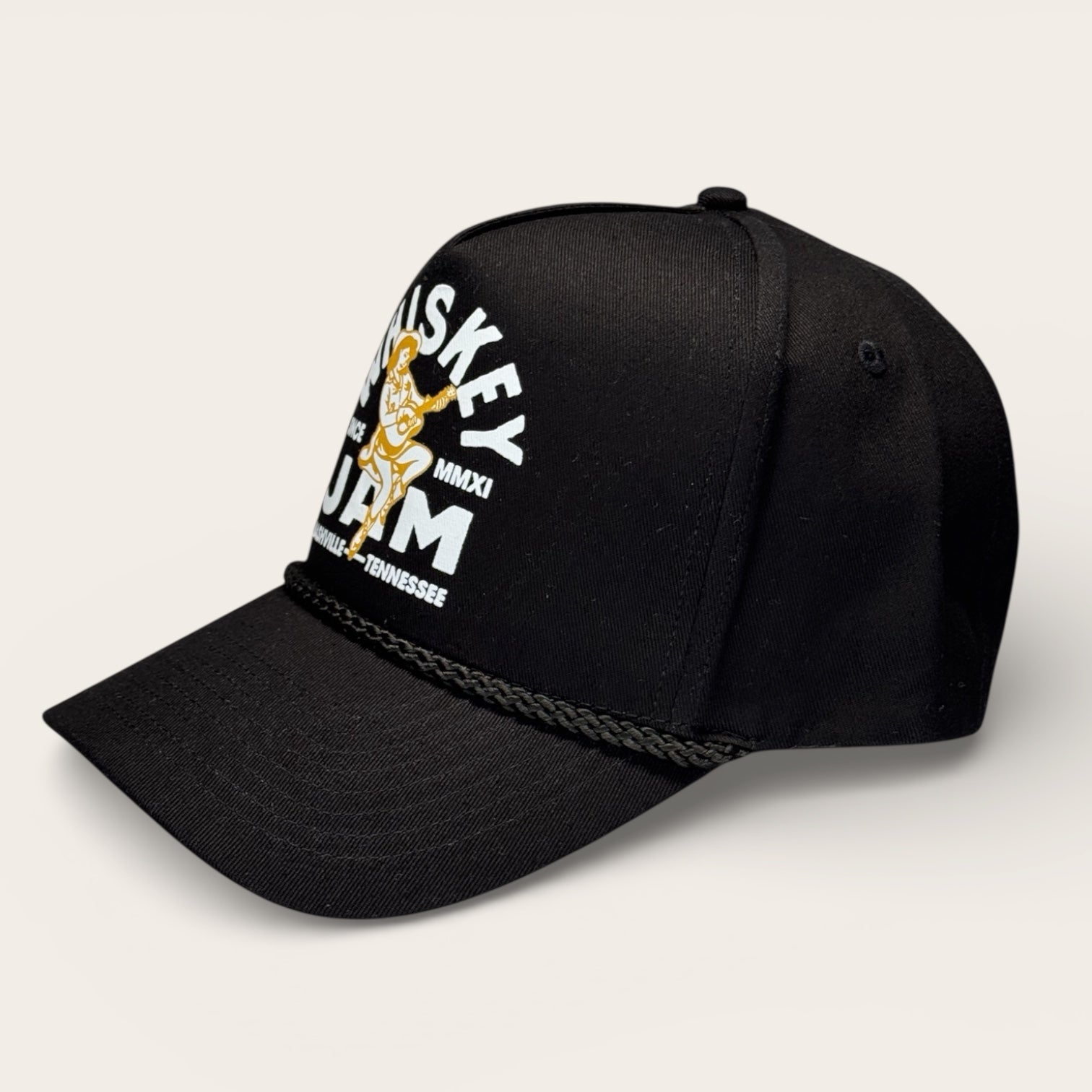 Not for the faint of head - these things are ROOMY. Extra high-crown Cobra brand, full panel (not a mesh-back) snapback. Black with a black braided rope, snapback closure.
