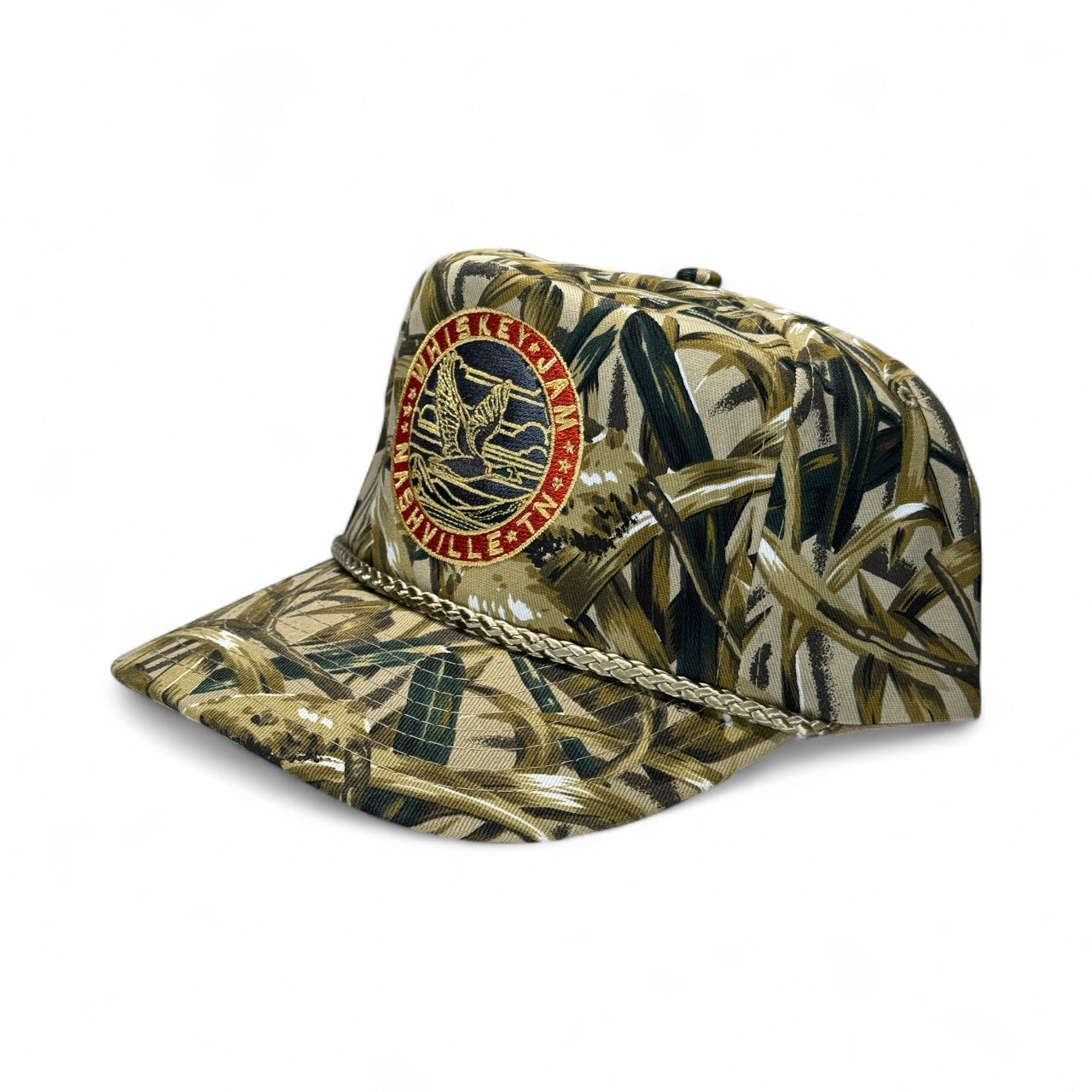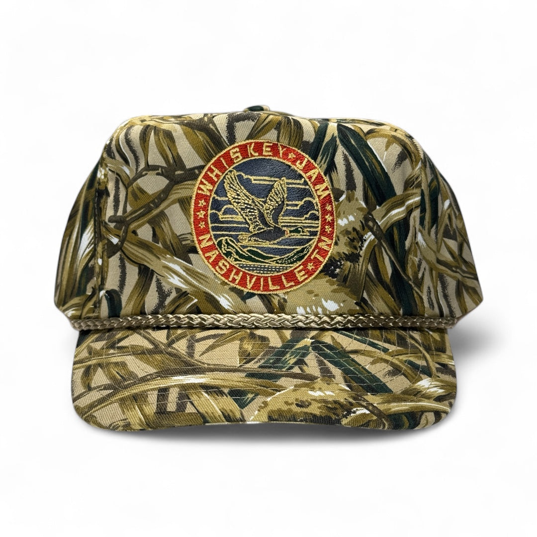 Sometimes you just want to blend in. You might as well look good while you do it. Nissun reed camo full-panel (not a trucker) with reinforcement panel behind the bill. Snapback closure & embroidered patch design with a braided rope.